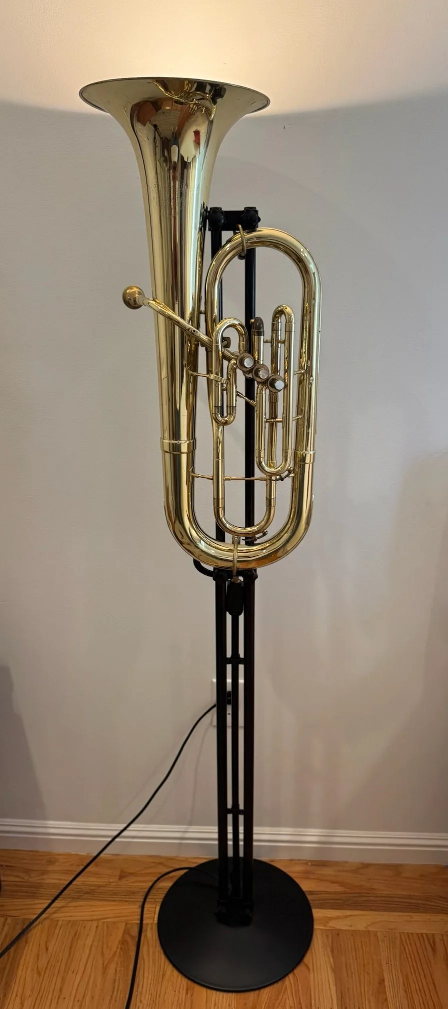 This euphonium is mounted on a black stand with a lamp mounted in the bell casting a bright light upward to light your space.